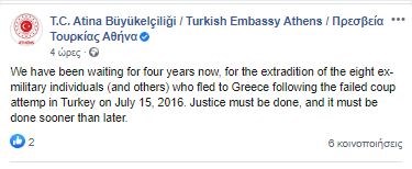 Η τουρκική πρεσβεία σε ανάρτησή της στο Facebook σημειώνει: “Περιμένουμε εδώ και τέσσερα χρόνια για την έκδοση των οκτώ πρώην αξιωματικών (και άλλων) που διέφυγαν στην Ελλάδα μετά το αποτυχημένο πραξικόπημα στην Τουρκία στις 15 Ιουλίου του 2016. Πρέπει να αποδοθεί δικαιοσύνη και αυτό πρέπει να γίνει το συντομότερο δυνατόν”.