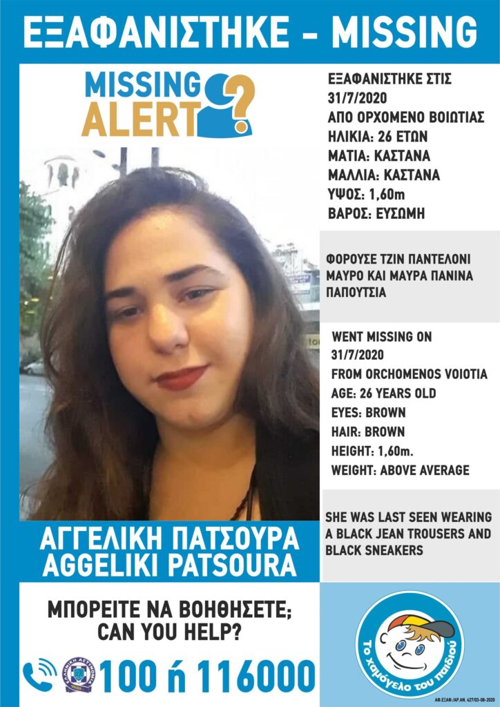 Σε συναγερμό έχουν τεθεί οι αρμόδιες Αρχές για την 26χρονη Αγγελική Πατσούρα. Τα ίχνη της Αγγελικής χάθηκαν το μεσημέρι της 31ης Ιουλίου 2020, από τον Ορχομενό.
