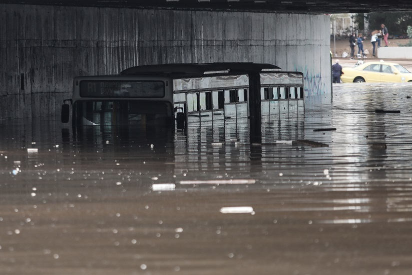 Ένα λεωφορείο βούλιαξε μέχρι τη μέση όταν πλημμύρισε η γέφυρα στο ύψος του Ιδρύματος Σταύρος Νιάρχος, στην παλαιά Λεωφόρο Ποσειδώνος.