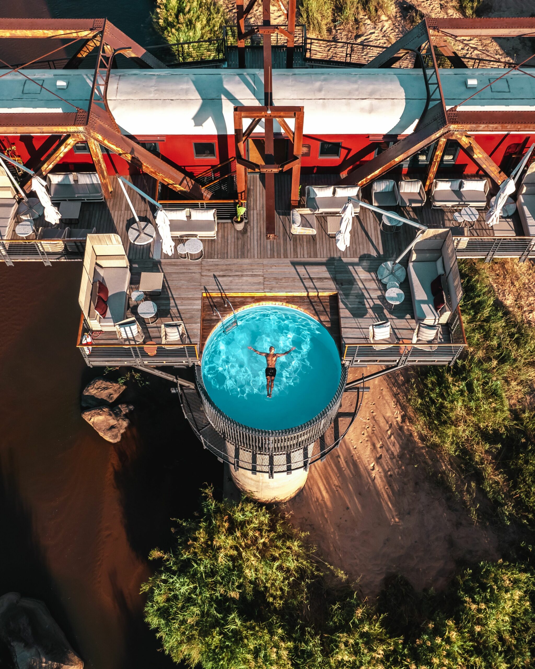 Το Train on the Bridge είναι ένα ξενοδοχείο εντός του Εθνικού Πάρκου Kruger, όπου ζουν άγρια ζώα όπως λιοντάρια, λεοπαρδάλεις, ρινόκεροι, ελέφαντες και βουβάλια. Tα βαγόνια ενός τρένου έχουν μετατραπεί σε 24 μοντέρνες σουίτες με μπαλκόνια και μια πισίνα πάνω από τον ποταμό Sabie.