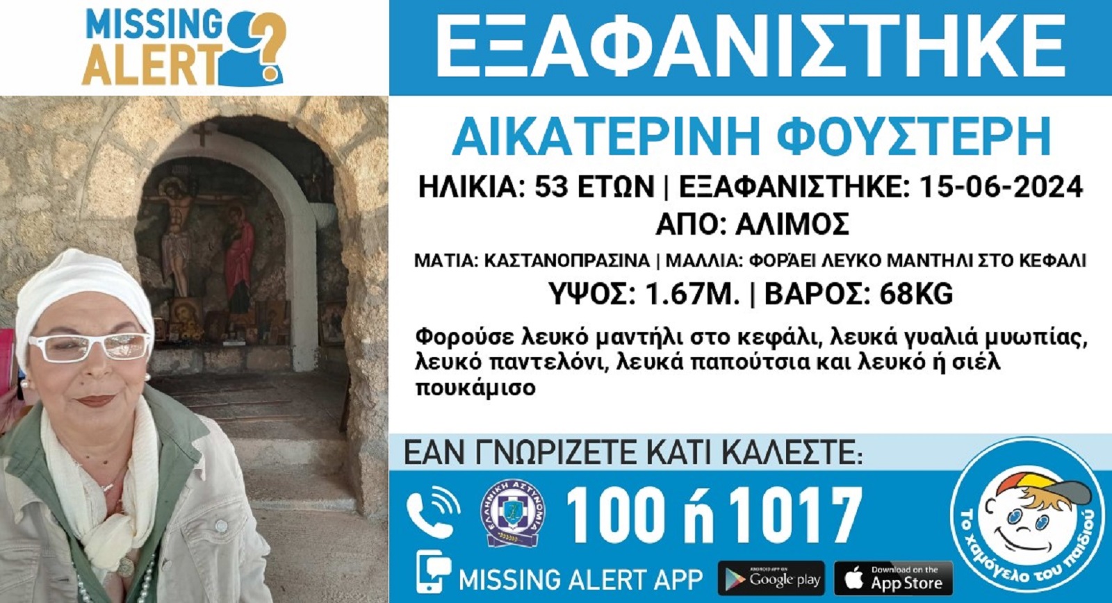 Συναγερμός έχει σημάνει στις Αρχές μετά την εξαφάνιση της 53χρονης Αικατερίνης Φουστέρη, τα ίχνη της οποίας χάθηκαν το πρωί του Σαββάτου (15/06).