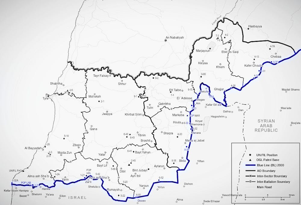 - Επί του παρόντος, η περιοχή επιχειρήσεων της Unifil εκτείνεται από τη γαλάζια γραμμή βόρεια έως τον ποταμό Λιτάνι, και ανατολικά έως τους πρόποδες των υψιπέδων του Γκολάν. Παρά τις τακτικές περιπολίες της Unifil και της LAF, η Χεζμπολάχ πιστεύεται ότι διατηρεί στρατιωτική παρουσία νότια του Λιτάνι.
