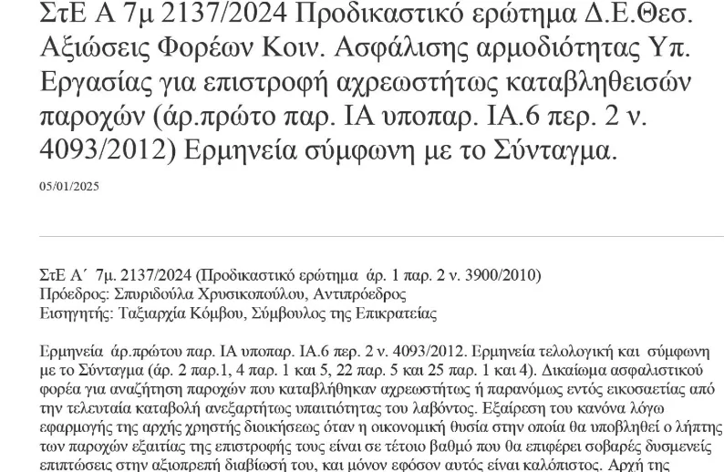 Πρόκειται για απόφαση-σταθμό με την οποία μπορεί να ακυρωθούν πολλές επιστροφές συντάξεων και επιδομάτων όταν διαπιστώνεται εκ των υστέρων και με καθυστέρηση από τον ΕΦΚΑ ότι οι ασφαλισμένοι δεν δικαιούνται τις εν λόγω παροχές, καθώς το σκεπτικό της απόφασης είναι ότι αν οι εν λόγω επιστροφές φέρνουν σε δυσμενή οικονομική θέση τους ασφαλισμένους, τότε αυτοί θα πρέπει να εξαιρούνται από την επιστροφή τους, από τη στιγμή που τις έλαβαν καλόπιστα.