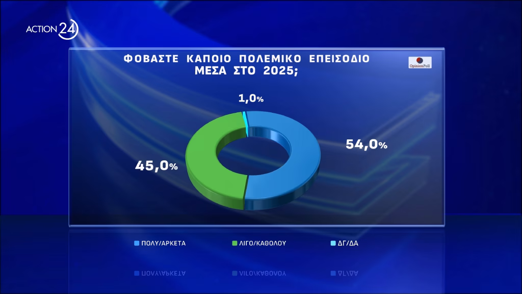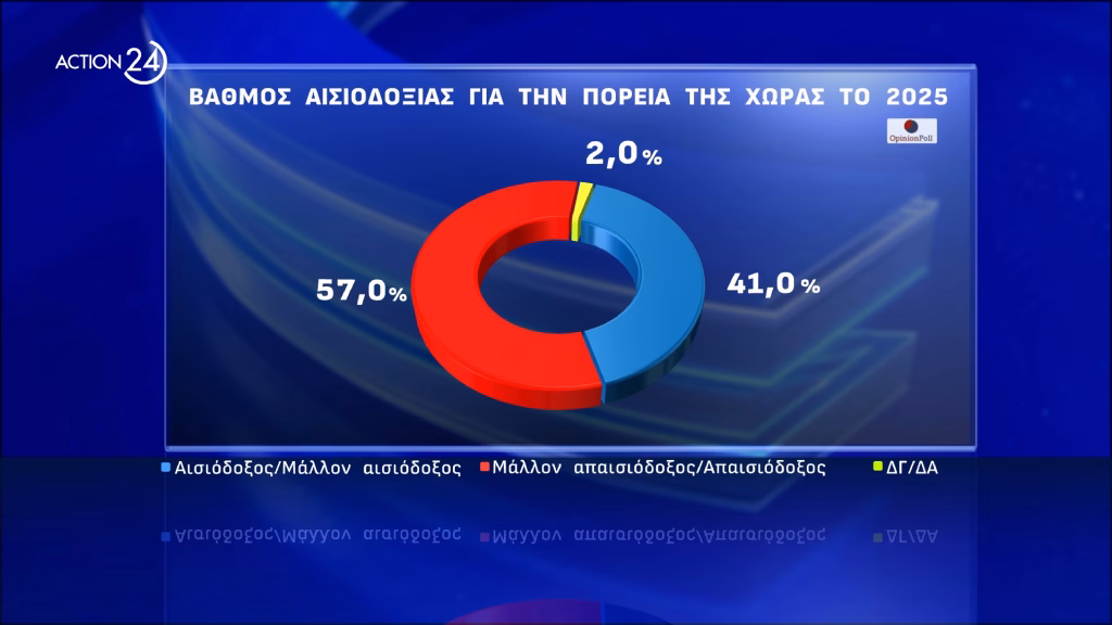 Το 57% δηλώνουν απαισιόδοξοικαι μάλλον απαισιόδοξοιγια την πορεία της χώρας την νέα χρονιά, ενώ το 41% αισιόδοξοι. Σημειώνεται πάντως, ότι αν και κυριαρχεί η απαισιοδοξία, έχει ανέβει το ποσοστό όσων δηλώνουν αισιόδοξοι , που κατά την διάρκεια του 2024 δεν είχαν ξεπεράσει το 35%-36%.