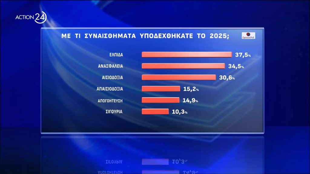 Όσον αφορά τα συναισθήματα με τα οποία έχουν υποδεχθεί οι πολίτες το 2025 με την σημείωση ότιοι απαντώντες είχαν δυνατότητα να δώσουν δύο απαντήσεις, με αύξουσα σειρά εμφανίζονται: Ελπίδα 37.5%, ανασφάλεια 34.5%, αισιοδοξία 30.6% , απαισιοδοξία 15.2%, απογοήτευση 14.9%, σιγουριά 10.3%.