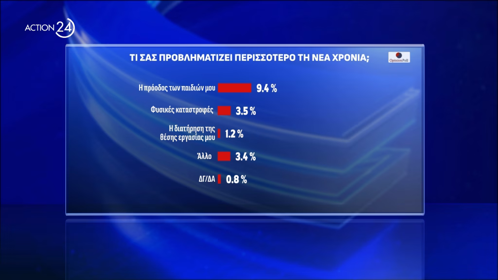 Τα θέματα πουπροβληματίζουν προσωπικά περισσότερο την νέα χρονιά είναι: Η οικονομική κατάσταση (προσωπική και της οικογένειας) 32.3%, η κατάσταση της υγείας 15.7%, η ένταση στην περιοχή και οι κίνδυνοι για την χώρα 12.6%, η έντονη παραβατικότητα 11.3%, η σταθερότητα στην χώρα 9.9%, η μορφωτική και επαγγελματική πρόοδος των παιδιών 9.4%, ο κίνδυνος φυσικών καταστροφών 3.5% κ.λ.π