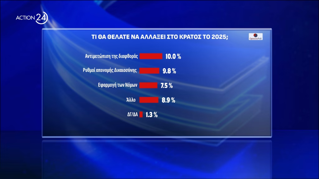 Η οικονομία( ακρίβεια, μισθοί κ.λ.π) είναι το πρώτο που θέλουν να αλλάξει μέσα στο 2025 στο Κράτος με 31.4% ( δυνατότητα μέχρι δύο απαντήσεων).Ακολουθούν : Βελτίωση υποδομών Υγείας 17.2%, Αντιμετώπιση παραβατικότητας 15.3%, Αξιοκρατία σε όλα τα επίπεδα 14.5%, ισότιμη αντιμετώπιση όλων των πολιτών, αντιμετώπιση της διαφθοράς 10%, ρυθμοί απονομής δικαιοσύνης 9.8%. εφαρμογή των Νόμων 7.5%, περισσότερη διαφάνεια 7.2%, μείωση γραφειοκρατίας 5.6%, βελτίωση ποιότητας μόρφωσης 5.1%, αύξηση των αντανακλαστικών αντιμετώπισης των προβλημάτων κ.λ.π.