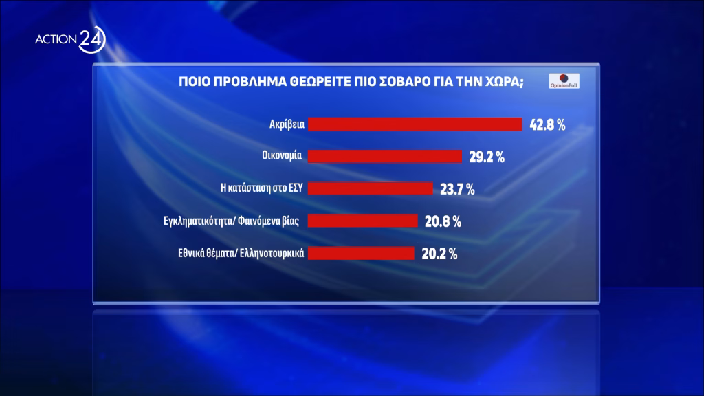 Στα προβλήματα που θεωρούνται πιο σοβαρά για την χώρα , που απασχολούν περισσότερο ( μέχρι τρεις απαντήσεις) προηγούνται σταθερά η ακρίβεια με 42.8% και οικονομία με 29.2% , αν και παρατηρείται μια σταδιακή μείωση των ποσοστών( 50.7% και 48.9% αντίστοιχα τον Δεκέμβριο). Ακολουθούν η κατάσταση στο ΕΣΥ 23.7% , εγκληματικότητα/ παραβατικότητα 20.8%, εθνικά θέματα / ελληνοτουρκικά 20.2%, ύψος μισθών και συντάξεων 16.5%, κόστος ενέργειας 11.9%, κατάσταση Παιδείας 8%, Μεταναστευτικό/ προσφυγικό 7.7%, Διεθνής ένταση ( Συρία κ.λ.π) 7.1% κ.λ.π Εμφανίζεται μια σαφής αύξηση των εθνικών θεμάτων και στην δεκάδα των προβλημάτων εμφανίζεται η διεθνής ένταση.