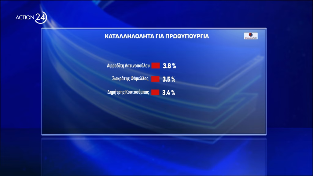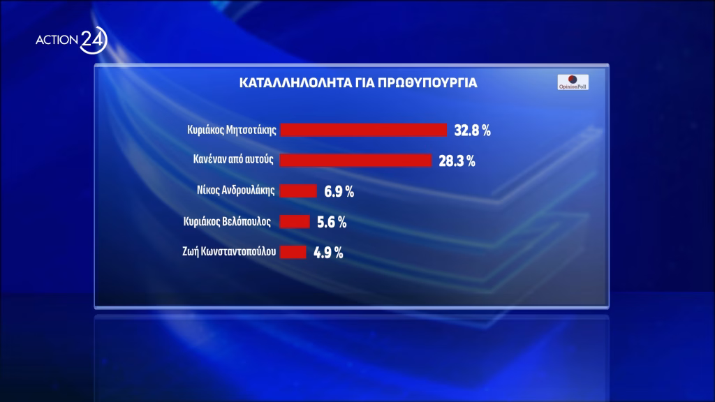 Ο Πρωθυπουργός υπερέχει κατά 25.9% του δεύτερου Ν. Ανδρουλάκη στην καταλληλότητα για Πρωθυπουργός . Συγκεντρώνει το 32.8% ( 32.4% τον Δεκέμβριο) των προτιμήσεων έναντι του 6.9% ( 7.9% τον Δεκέμβριο). Ακολουθούν οι υπόλοιποι Πολιτικοί Αρχηγοί με τον ΚΑΝΕΝΑ πάντως να βρίσκεται στο 28.3%.