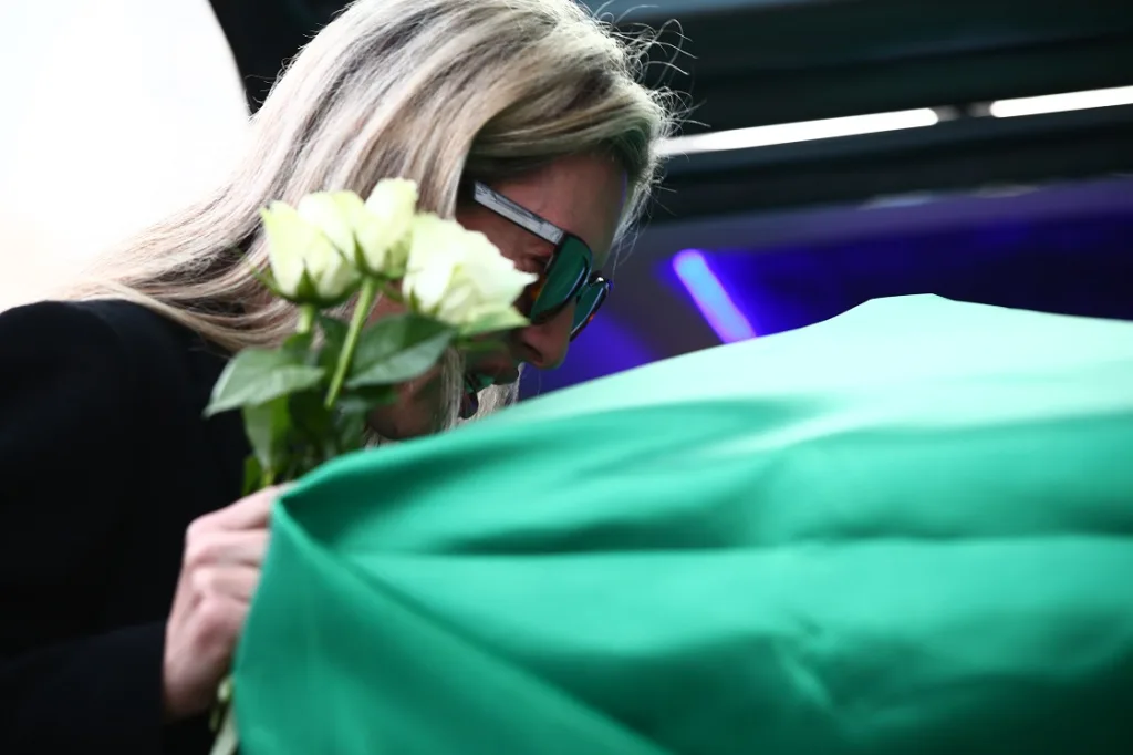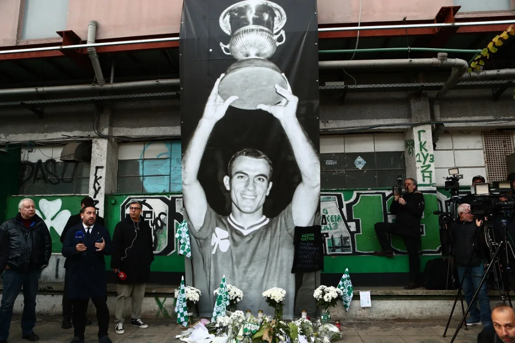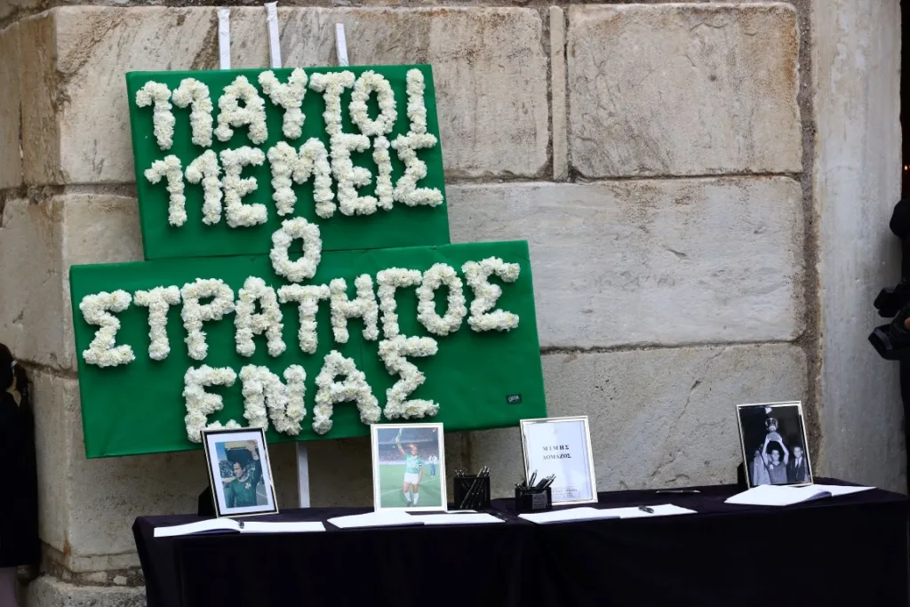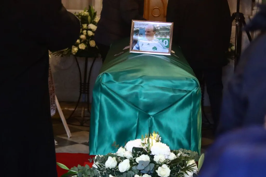 Πλήθος κόσμου να έχει δώσει το παρών για να αποχαιρετήσει τον θρυλικό ποδοσφαιριστή, καταθέτοντας αρκετά στεφάνια.