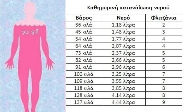 Η ποσότητα νερού που πρέπει να λαμβάνει ένας άνθρωπος ανάλογα με το βάρος του αποτυπώνεται στον παρακάτω πίνακα, αν και οι διατροφολόγοι επισημαίνουν ότι πρέπει να λαμβάνονται υπόψη και άλλα στοιχεία της καθημερινότητας, όπως η διατροφή, η άσκηση και οι καιρικές συνθήκες.