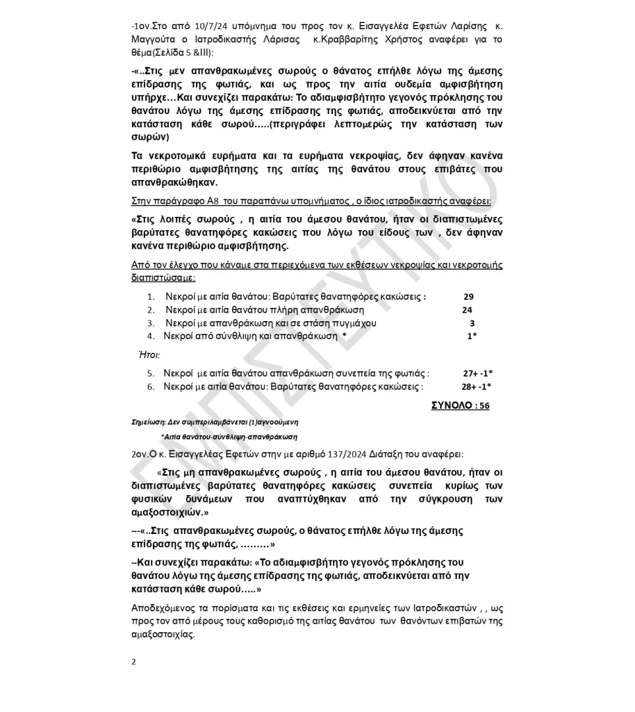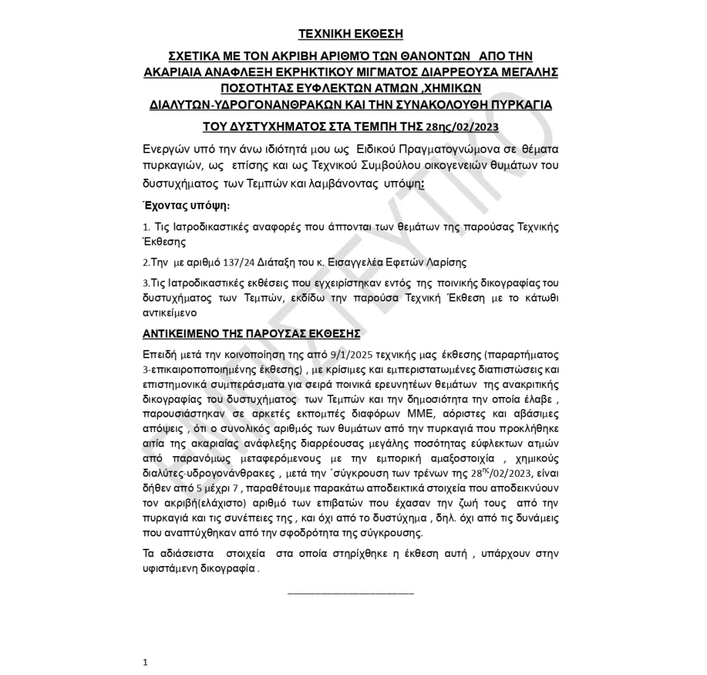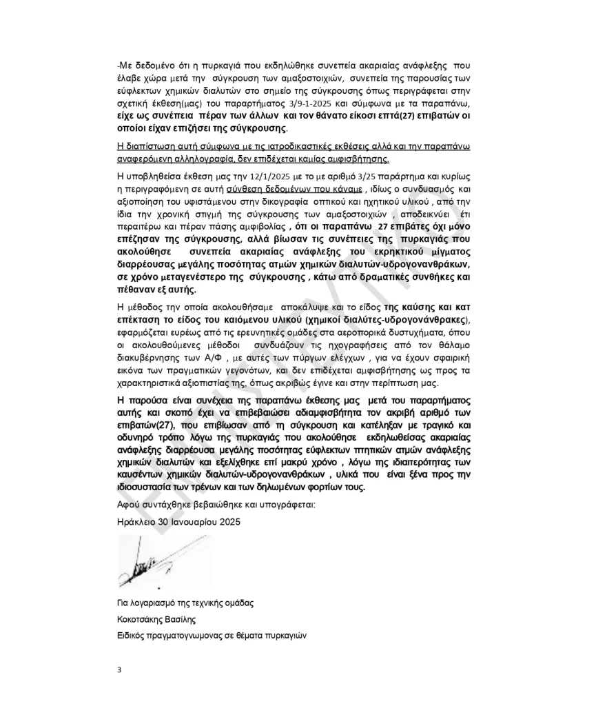 Σύμφωνα με τους τεχνικούς συμβούλους των οικογενειών, «με δεδομένο ότι η πυρκαγιά που εκδηλώθηκε συνεπεία ακαριαίας ανάφλεξης που έλαβε χώρα μετά την σύγκρουση των αμαξοστοιχιών, συνεπεία της παρουσίας των εύφλεκτων χημικών διαλυτών στο σημείο της σύγκρουσης όπως περιγράφεται στην σχετική έκθεση(μας) του παραρτήματος 3/9-1-2025 και σύμφωνα με τα παραπάνω, είχε ως συνέπεια πέραν των άλλων και τον θάνατο είκοσι επτά (27) επιβατών οι οποίοι είχαν επιζήσει της σύγκρουσης. Η διαπίστωση αυτή σύμφωνα με τις ιατροδικαστικές εκθέσεις αλλά και την παραπάνω αναφερόμενη αλληλογραφία, δεν επιδέχεται καμίας αμφισβήτησης».