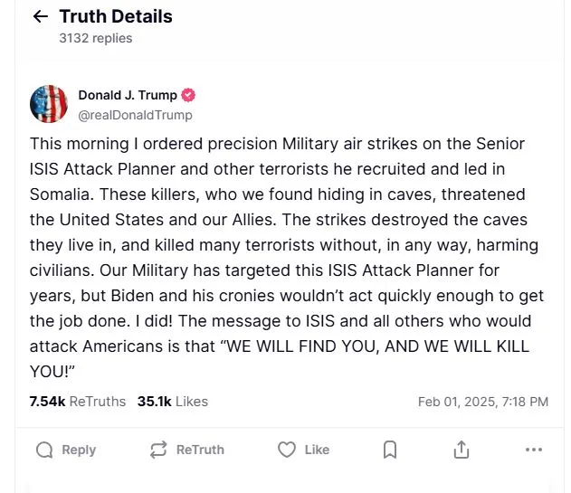 «Σήμερα το πρωί διέταξα στρατιωτικές αεροπορικές επιδρομές ακριβείας κατά του ανώτερου σχεδιαστή επιθέσεων του ISIS και άλλων τρομοκρατών που στρατολόγησε και καθοδηγούσε στη Σομαλία. Αυτοί οι δολοφόνοι, τους οποίους βρήκαμε να κρύβονται σε σπηλιές, απειλούσαν τις Ηνωμένες Πολιτείες και τους Συμμάχους μας.