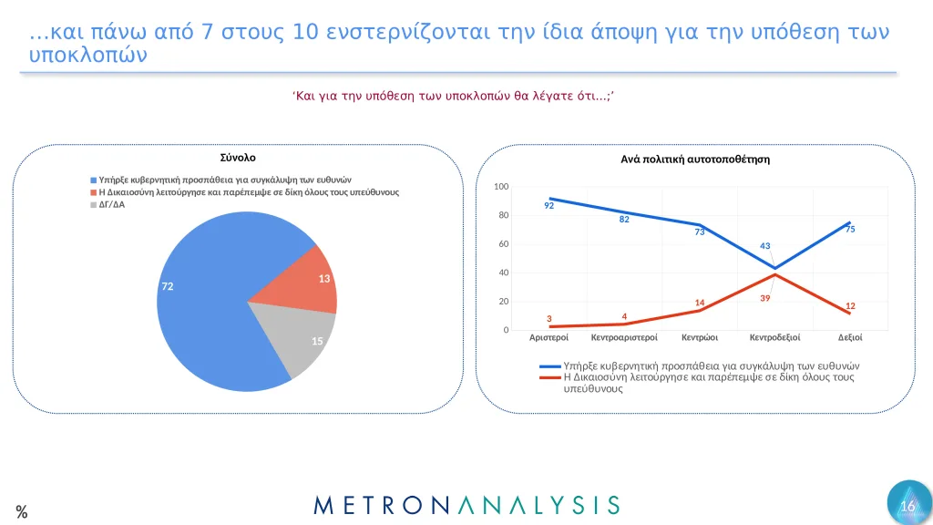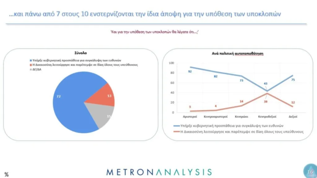 - Τα στοιχεία δείχνουν έντονες διαφοροποιήσεις ανάλογα με την πολιτική αυτοτοποθέτηση των ερωτηθέντων. Η πλειοψηφία των κεντροδεξιών και δεξιών εμφανίζεται πιο επιεικής απέναντι στην κυβέρνηση, σε αντίθεση με τους αριστερούς και κεντροαριστερούς, που σε ποσοστά άνω του 80%-90% μιλούν για συγκάλυψη.