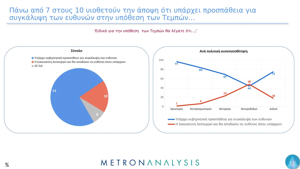 - Το 72% των ερωτηθέντων εκτιμά ότι υπήρξε κυβερνητική προσπάθεια συγκάλυψης των ευθυνών, ενώ μόλις το 13% πιστεύει ότι η Δικαιοσύνη λειτούργησε σωστά και παρέπεμψε όλους τους υπευθύνους.