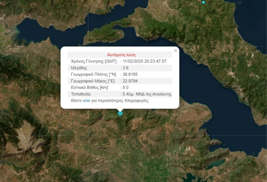 Σεισμική δόνηση μεγέθους 3,6 Ρίχτερ καταγράφηκε το βράδυ της Τρίτης (11/02) στην περιοχή της Αταλάντης.