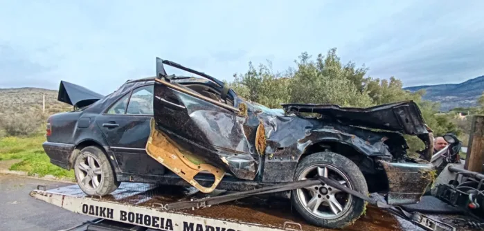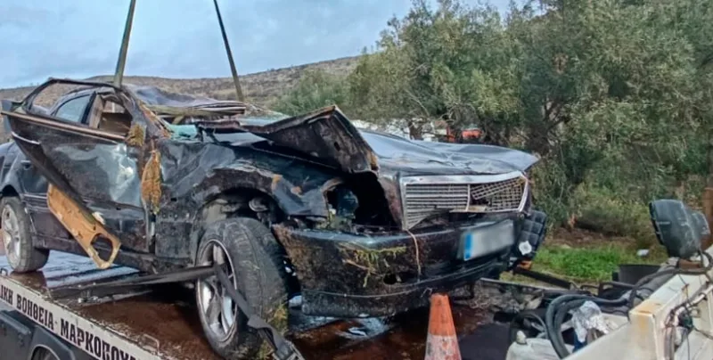Το αμάξι ακολούθησε μια «τρελή» πορεία και με ιλιγγιώδη ταχύτητα χτύπησε αρχικά στο κράσπεδο στη συνέχεια σε μια ελιά και κατέληξε αναποδογυρισμένο σε ένα διπλανό χωράφι.