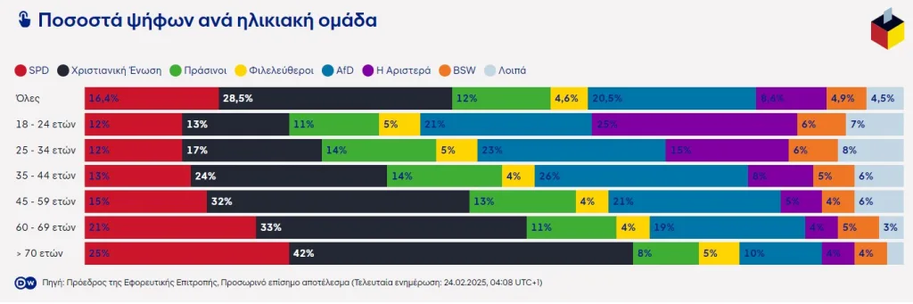 Στα διαδραστικά γραφικά για τα ποσοστά ανά ηλικιακή ομάδα διαπιστώνουμε ότι οι 70 και άνω προτίμησαν τους Συντηρητικούς (42%), αλλά και τους Σοσιαλδημοκράτες (25%). Ιδιαίτερο ενδιαφέρον έχει ότι το 25% των νέων 18-24 ετών έδωσαν την ψήφο τους στο κόμμα H Αριστερά (Die Linke) και κατά 21% στην Εναλλακτική για τη Γερμανία (AfD). Τα αντίστοιχα ποσοστά στις ηλικίες 25-34 είναι 23% AfD και 15% Die Linke. Στις ηλικίες 35-44 η Εναλλακτική για τη Γερμανία συγκεντρώνει τις περισσότερους ψήφους.