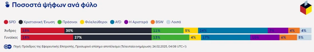 Το 30% των ανδρών και το 27% των γυναικών έδωσαν χθες τη ψήφο τους στους Συντηρητικούς του Φρίντριχ Μερτς. Την ίδια στιγμή το 18% των γυναικών και το 15% των ανδρών ψήφισαν τους Σοσιαλδημοκράτες του Όλαφ Σολτς. Μεγαλύτερες είναι οι διαφορές μεταξύ ανδρών και γυναικών ως προς τη ψήφο στην Εναλλακτική για τη Γερμανία: AfD ψήφισε το 24% των ανδρών και το 17% των γυναικών. Ποσοστά πάνω από το μέσο όρο τους συγκεντρώνουν στις γυναίκες και η Αριστερά και το SPD.