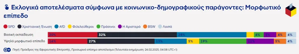 Αξιοσημείωτο ότι αναφορικά με το μορφωτικό επίπεδο, οι άνθρωποι με υψηλότερη μόρφωση προτιμούν τους Συντηρητικούς (27%), ενώ μόλις 13% την AfD. Οι Πράσινοι διασφαλίζουν σε αυτή τη κατηγορία 19%. Στον αντίποδα 28% των πολιτών με βασικό επίπεδο μόρφωσης επέλεξε την AfD και το 32% την Χριστιανική Ένωση.