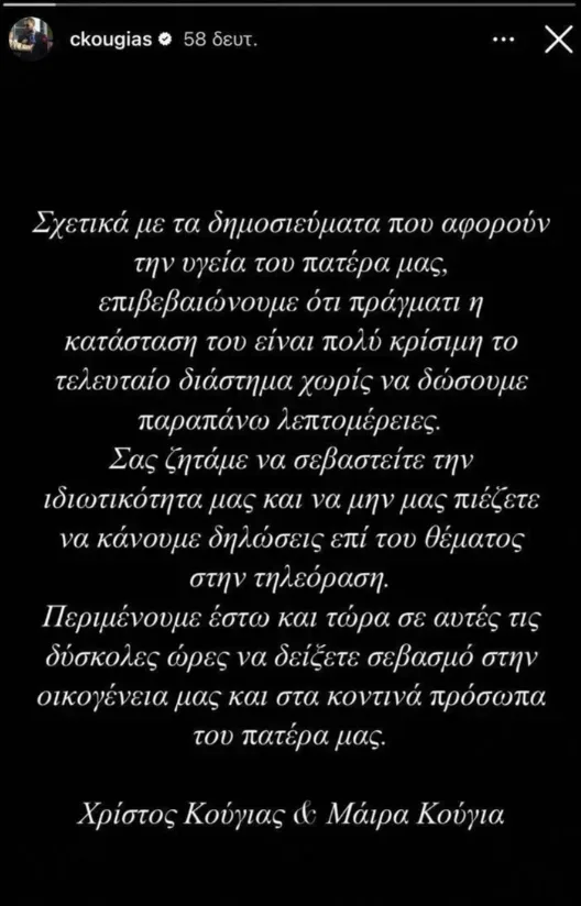 Περιμένουμε έστω και τώρα σε αυτές τις δύσκολες ώρες να δείξετε σεβασμό στην οικογένειά μας και στα κοντινά πρόσωπα του πατέρα μας».