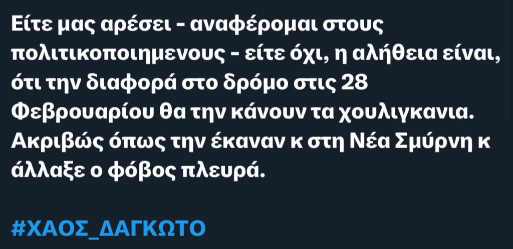 την άμεση παρέμβαση της Εισαγγελίας Πρωτοδικών Αθηνών προκάλεσαν οι καταγγελίες για πλήθος αναρτήσεων στα μέσα κοινωνικής δικτύωσης, που καλούν σε βιαιοπραγίες εν όψει των πολυπληθών, όπως αναμένεται, συγκεντρώσεων της 28ης Φεβρουαρίου 2025, δύο χρόνια μετά το φρικιαστικό δυστύχημα των Τεμπών, με τραγικό απολογισμό τον θάνατο 57 συνανθρώπων μας.