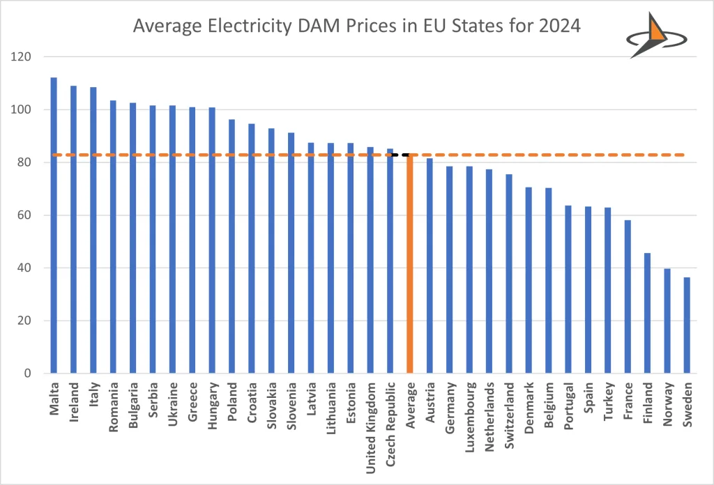 Σχήμα 1. Μέσες ετήσιες τιμές 2024 σε αγορές επόμενης ημέρας (DAM) στις Ευρωπαϊκές χώρες