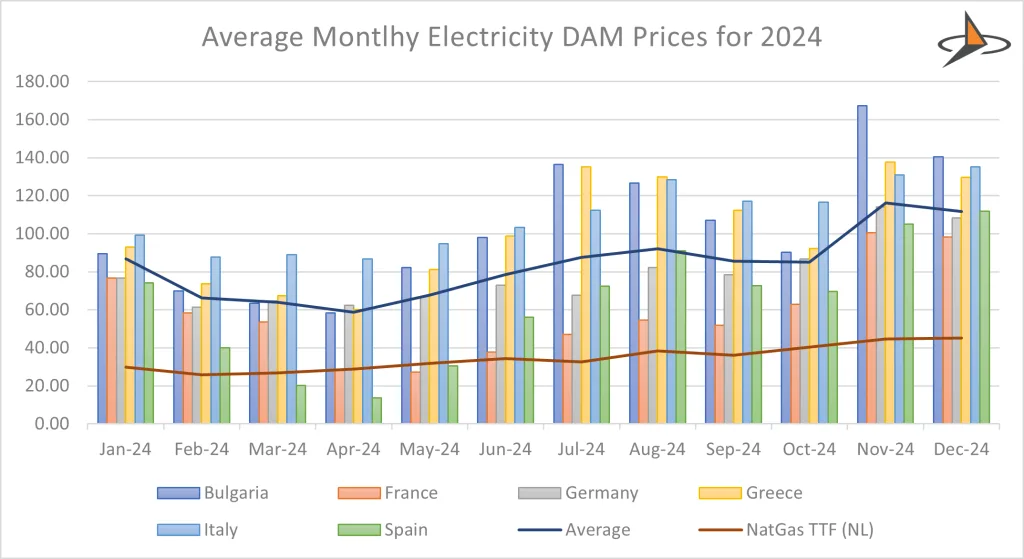 Σχήμα 3. Μέσες μηνιαίες τιμές ενέργειας στην αγορά επόμενης ημέρας (DAM) στη Βουλγαρία, Γαλλία, Γερμανία, Ελλάδα, Ιταλία και Ισπανία, ο Ευρωπαϊκός μέσος όρος και οι τιμές Φυσικού Αερίου (TTF).