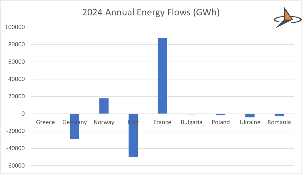 Το 2024 η Ελλάδα έγινε για πρώτη φορά τα τελευταία χρόνια εξαγωγική, γεγονός που είναι αναμφισβήτητα θετικό. Στην ενιαία αγορά ενέργειας οι εξαγωγές ενέργειας από μια χώρα είναι ενδεικτικές χαμηλότερων τιμών ενέργειας τουλάχιστον από τις γειτονικές τους χώρες, και το αντίθετο. Στο Σχήμα 4 παρουσιάζονται οι ροές ισχύος στις διασυνδετικές γραμμές μεταξύ των χωρών. Παρατηρούμε ότι η Γαλλία και η Νορβηγία λειτούργησαν το 2024 ως καθαροί εξαγωγείς ενέργειας, ενώ η Ιταλία και η Γερμανία ήταν οι κύριοι εισαγωγείς. Η Ελλάδα εμφανίζει οριακά θετικό ισοζύγιο στις εξαγωγές, ενώ η Ουκρανία εμφανίζεται ως εισαγωγέας μικρών ποσοτήτων. Συνεπώς, μπορούμε να συμπεράνουμε ότι η Γερμανία και η Ιταλία είναι οι χώρες που ασκούν τη μεγαλύτερη πίεση στις Ευρωπαϊκές τιμές, οδηγώντας τις προς τα πάνω. Θα πρέπει να σημειωθεί πάντως ότι η αύξηση των εξαγωγών δε σημαίνει και μείωση των τιμών ενέργειας στη χώρα, αντιθέτως αυξάνει εμμέσως τις τιμές, αφού φτηνή ενέργεια εξάγεται. Είναι ενδιαφέρον επίσης ότι η Ελλάδα, αν και εξαγωγέας ενέργειας, παρουσιάζει υψηλότερες τιμές από τη Γερμανία, γεγονός που αναδεικνύει τη μεγάλη σημασία των διασυνδέσεων για τη λειτουργία της ενιαίας αγοράς.