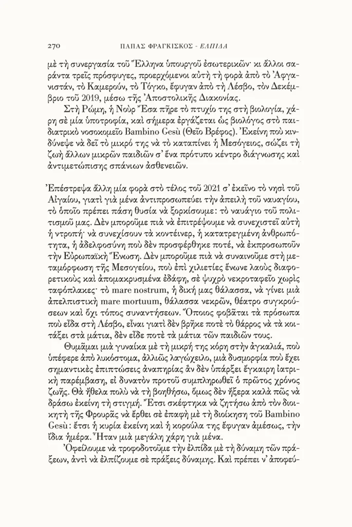 Γράφει ο Ποντίφικας: «Με αυτούς τους στοχασμούς στην ψυχή, λίγους μήνες μετά το Ιράκ, επέστρεψα στη Λέσβο, το ελληνικό νησί που φιλοξενεί το κέντρο μεταναστών της Μόριας, το μεγαλύτερο της Ευρώπης, που για πάρα πολύ καιρό έδειχνε το πρόσωπο της αποτυχίας της μεταναστευτικής πολιτικής της γηραιάς Ευρώπης. Είχα ξαναβρεθεί εκεί πέντε χρόνια νωρίτερα, το 2016, σε ένα ταξίδι-αστραπή με τον Πατριάρχη Βαρθολομαίο, τον Αρχιεπίσκοπο της Ελλάδας Ιερώνυμο μετά από πρόσκληση του τότε Έλληνα Πρωθυπουργού Αλέξη Τσίπρα, ενός ανθρώπου προς τον οποίο έχω βαθύ σεβασμό. Ενός πολιτικού που ήξερε να αγωνίζεται για το καλό του λαού του.»