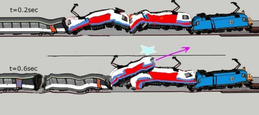 1. Λίγο μετά τις 23:18 οι δύο αμαξοστοιχίες συγκρούστηκαν μετωπικά, με την εμπορευματική να καταγράφει ταχύτητα περίπου 90 km/h ενώ η επιβατική ταξίδευε με ταχύτητα περίπου 150 km/h, και οι δύο εντός των επιτρεπόμενων ορίων ταχύτητας. Η σύγκρουση ήταν τεράστια. Οι δύο μηχανές της εμπορευματικής αμαξοστοιχίας κατέληξαν στην διπλανή γραμμή και προσέκρουσαν στον κατακόρυφο τοίχο αντιστήριξης, ενώ η μηχανή και το βαγόνι πρώτης θέσης της επιβατικής αμαξοστοιχίας εκτοξεύτηκαν στην άλλη πλευρά της γραμμής, όπου προσγειώθηκαν σε επίπεδο χαμηλότερο από τη γραμμή του τρένου στο έδαφος, και καταστράφηκαν ολοσχερώς.