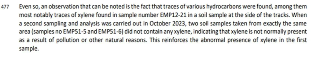 • Καταλήγοντας, στην επόμενη σελίδα του πορίσματος, την σελίδα 105, παράγαφο 477, αναφέρεται πως “βρέθηκαν ίχνη από διάφορους υδρογονάνθρακες, μεταξύ των οποίων πιο αξιοσημείωτα ίχνη ξυλολίου που βρέθηκαν στον αριθμό δείγματος (EMP12-21) σε δείγμα εδάφους στο πλάι των ραγών”.