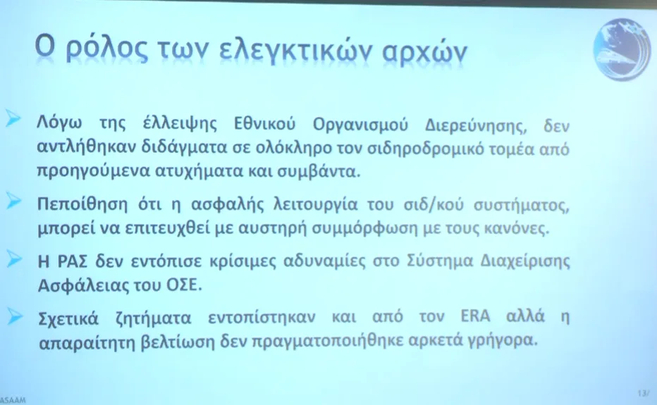 - Η ΡΑΣ να αναπτύξει ένα εναιίο σύστημα αναφοράς περιστατικών για όλους τους φορείς και να ενισχύσει την ικανότητα εποπτείας των σιδηροδρομικών φορέων.