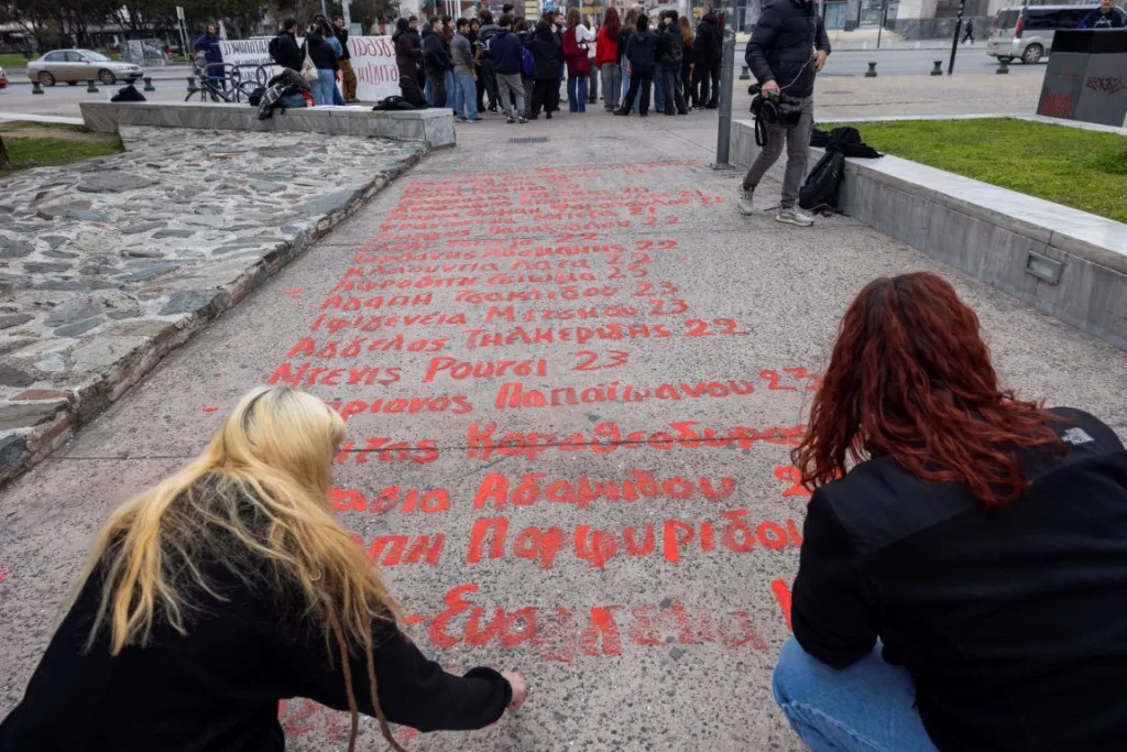 Στη Θεσσαλονίκη, 57 φοιτητές, όσοι και τα θύματα, συγκεντρώθηκαν μπροστά από τον Λευκό Πύργο. Με βαμμένες κόκκινες παλάμες, φώναξαν συνθήματα και έγραψαν στο δρόμο με κόκκινη μπογιά τα ονόματα των αδικοχαμένων.