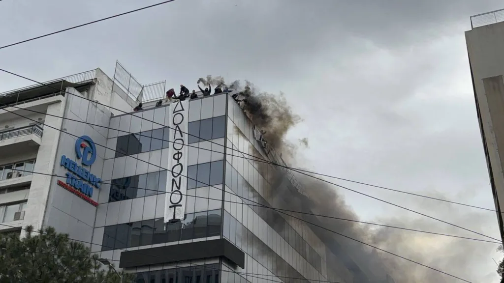 Μέλη του Ρουβίκωνα ανέβηκαν στην ταράτσα των γραφείων της Hellenic Train και κρέμασαν πανό με αφορμή τη συμπλήρωση δύο ετών από την τραγωδία των Τεμπών.