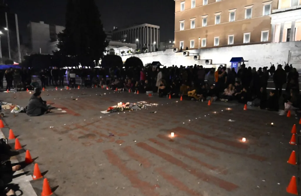 Περίπου 150 – 200 άτομα συγκεντρώθηκαν στη Βουλή και κάθισαν στο έδαφος, γύρω από το σημείο όπου είχαν γραφτεί τα ονόματα των νεκρών με κόκκινη μπογιά. Με τραγούδι και με συνθήματα ζήτησαν για μια ακόμη φορά να αποδοθεί δικαιοσύνη «για το έγκλημα στα Τέμπη», όπως ανέφεραν, και να «μπουν στη φυλακή» οι ιθύνοντες. Στο κέντρο είχαν ανάψει κεριά, πλαισιώνοντας τα ονόματα των θυμάτων και σχηματίζοντας τον αριθμό 57 (των νεκρών) ενώ κάποιοι πολίτες άφηναν και λουλούδια.