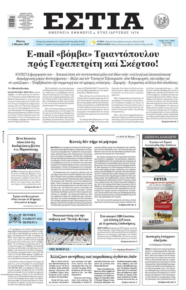 Η εφημερίδα Εστία αναφέρει σε πρωτοσέλιδο δημοσίευμά της φερόμενο e-mail του Χρήστου Τριαντόπουλου, στο οποίο, σύμφωνα με το έντυπο, ο τότε Υφυπουργός παρά τω Πρωθυπουργώ φέρεται να αποκαλύπτει τον συντονιστικό του ρόλο στο μπάζωμα στα Τέμπη.