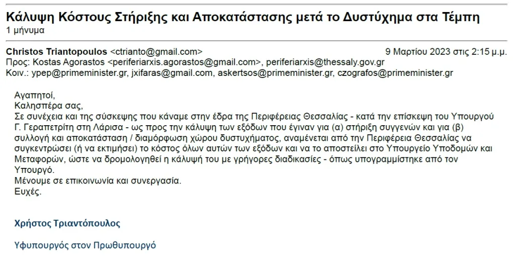 Όπως μπορείτε να δείτε αρχικά στο «θέμα» του μηνύματος, ο τίτλος ήταν «Κάλυψη κόστους στήριξης και αποκατάστασης μετά το δυστύχημα στα Τέμπη». Το μήνυμα είχε ως αποδέκτη τον τότε Περιφερειάρχη Θεσσαλίας, με κοινοποίηση στους υπολοίπους.