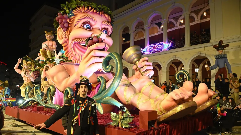 Ο Βασιλιάς Καρνάβαλος με τη μορφή του Διονύσου ηγήθηκε της παρέλασης, συνοδευόμενος από άρματα με κοινωνικά και πολιτικά σχόλια που ξεχώρισαν.