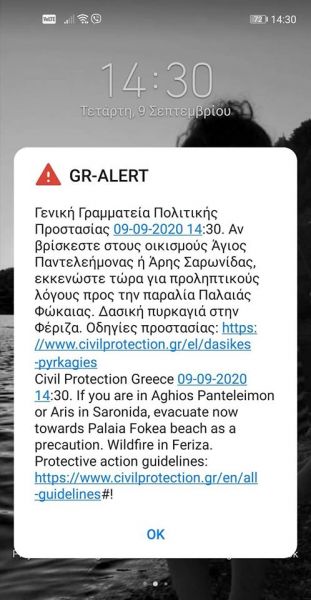 Νωρίτερα, αντίστοιχο μήνυμα εστάλη και στους κατοίκους του οικισμού Άγιος Παντελεήμονας ή Άρης Σαρωνίδας να κατευθυνθούν προς την παραλία της Παλαιάς Φώκαιας.